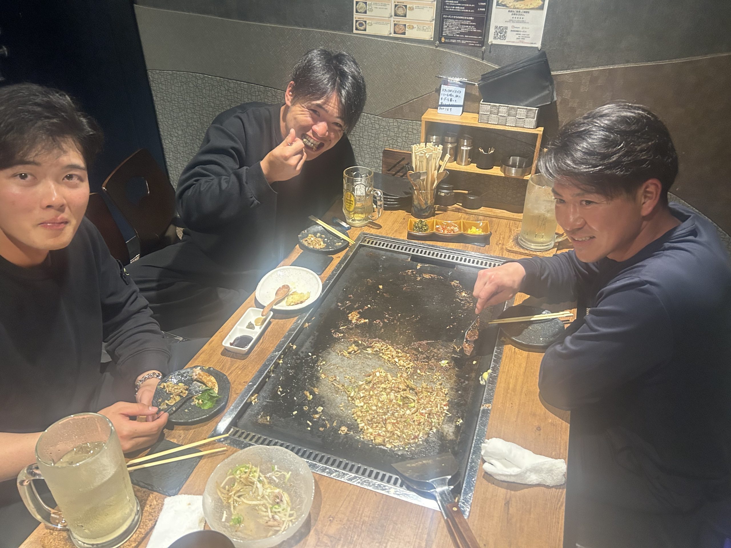 1本1本骨を抜いて食べやすい手羽先、出汁が効いて種類豊富なもんじゃ焼き、ポテトサラダも鉄板焼きで作るオリジナリティあふれる鉄板料理、ホッと安心する牛すじ煮込みなど、「揚」「焼」「煮」いろいろ楽しんでいただけるのがスリーバントです。