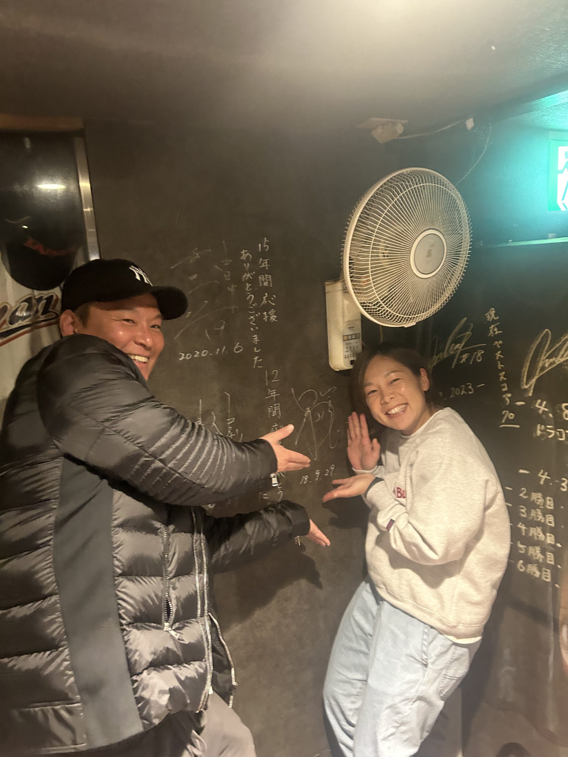 2026.01.17 ブログ 野本圭と原田のどかさん 松村の母校、岡山県立玉野光南高校の現野球部監督の田野さんが名古屋に出張でいらして、スリーバントに来てくださって教え子のソフトボール元日本代表の原田のどかさんも来て、たまたま居合わせたドラゴンズスカウトの野本圭と岡山県人が集まりました🍑 田野さんが川相さんの母校でもある岡山南高校に赴任していた時の教え子が原田さんで、野本圭と原田さんは高校の先輩後輩なのですが、この日が初対面でした🤝 写真は圭のユニフォームと記念撮影したものです😄